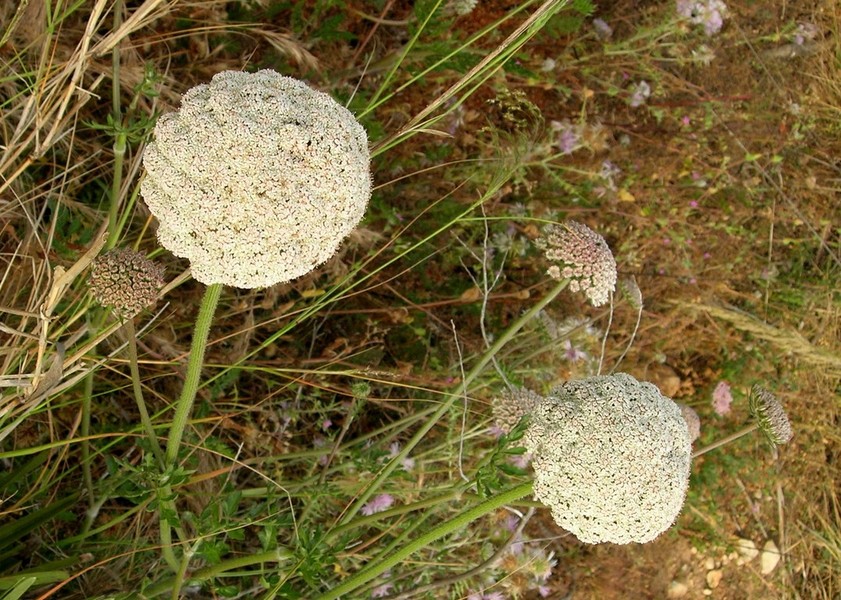 OBSERVACIONS:Aquesta espècie de daucus es diferencia de les altres subspècies que viuen a aquests ambients, perquè l’umbel·la s’obre completament formant una mena de bola. Les fulles a més tenen una consistència crassulescent i són d’un verd pàl·lid, al contrari que les subespècies que es troben als camps i camins, la umbel·la no es tanca sobre si mateixa al fructificar.