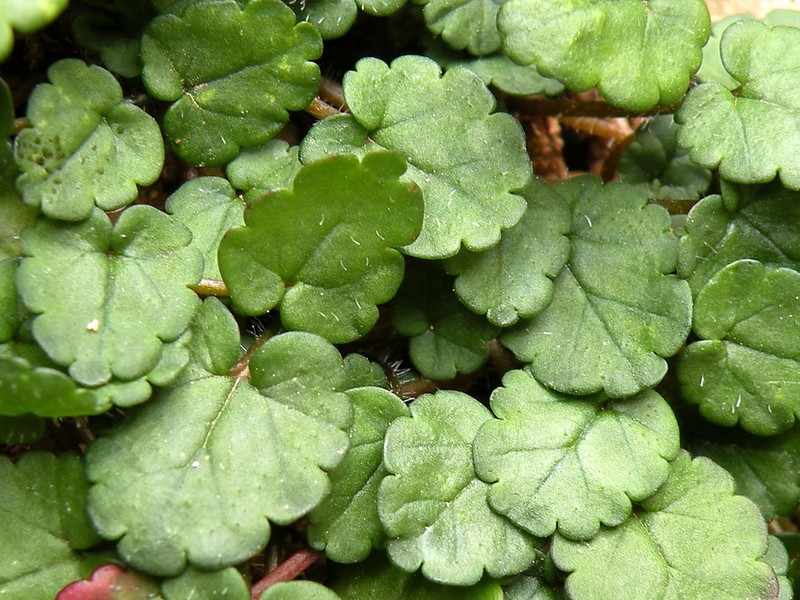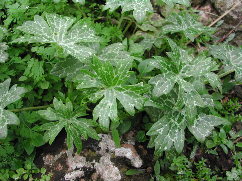 DESCRIPCIÓ DE LA PLANTA:Herba que surt cada any o cada dos anys. Te les fulles palmades amb taques blanquinoses. Les flors son blavenques.