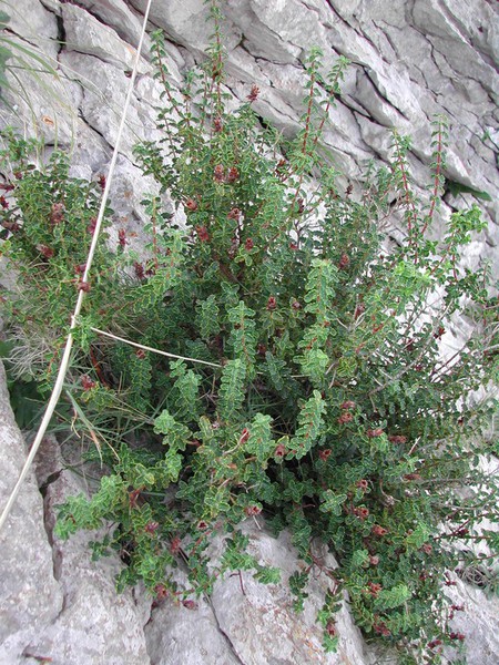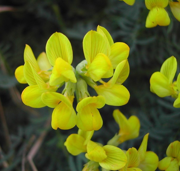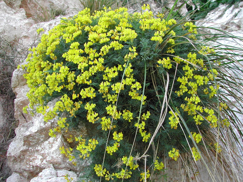 DESCRIPCIÓ DE LA PLANTA:Arbust perennifoli, llenyós, formant coixinets. Fulles glauques, peciolades, compostes, imparipinnades, amb els foliols oval-lanceolats. Flors grogues amb nerviacions vermelles. Fruit en llegum