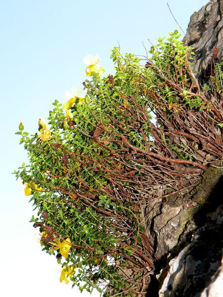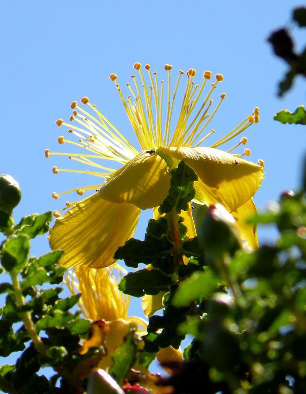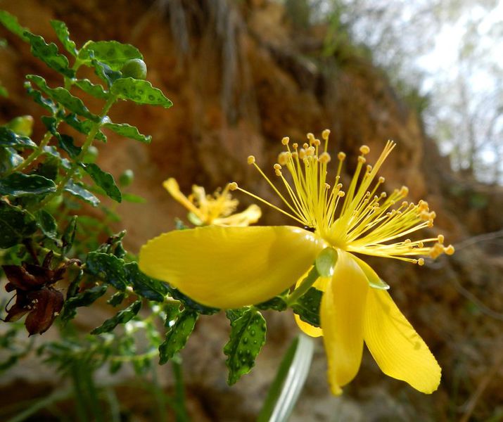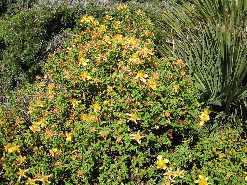 DESCRIPCIÓ DE LA PLANTA:Arbust molt esbrancat, sense pels. Fulles oblongues amb marge onejat. Flors grogues, grans amb els pètals irregulars. Estams nombrosos. Fruit molt aferradís.