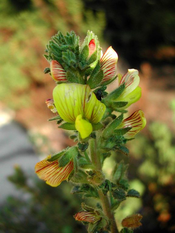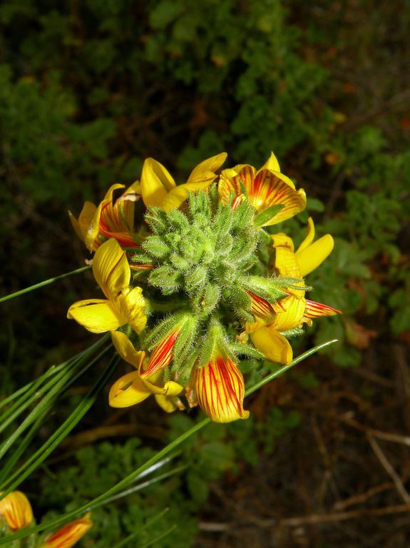 DESCRIPCIÓ DE LA PLANTA:Planta perenne,arbustiva, plena de pels amb glàndules que li donen un tacte molt viscós. Fulles compostes, les superiors trifoliades, les inferiors amb cinc foliols, amb estípules i marge onat, reüll i denticulat. Flors grogues amb estriacions vermellenques al revers de l’estendart. Fruit en llegum