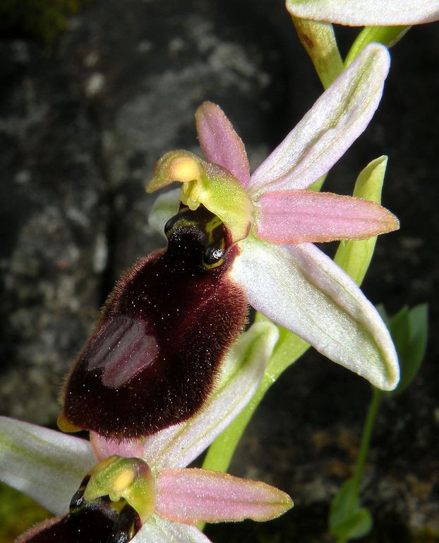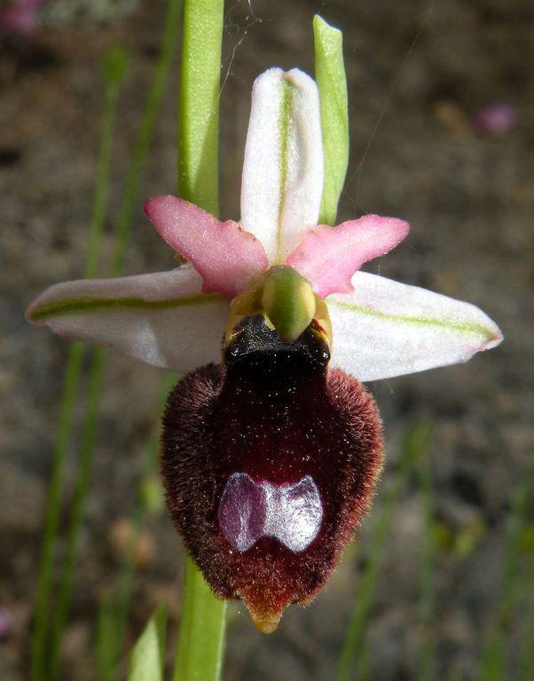 DESCRIPCIÓ DE LA PLANTA:Herba perenne, amb bulb. Fulles en roseta basal, lanceolades. Flors amb les peces externes del periant rosades, label porpra, vellutat, amb mirall blavenc
