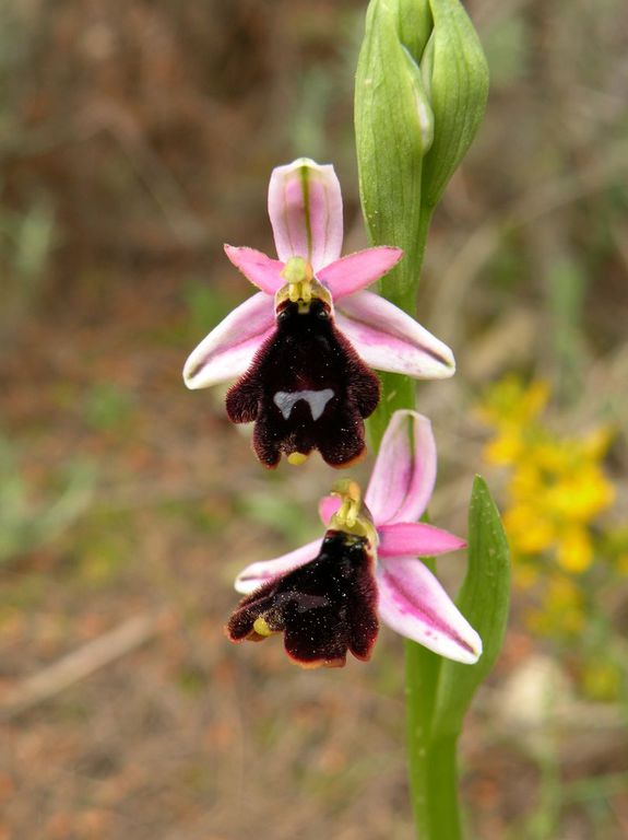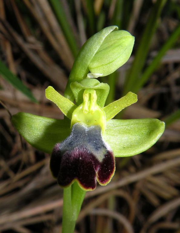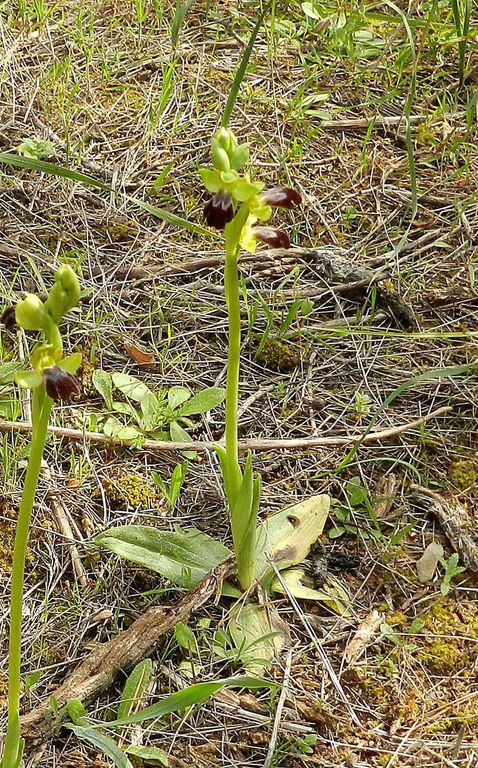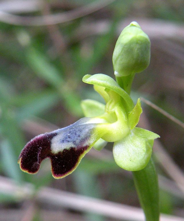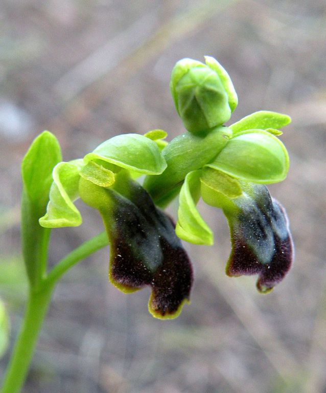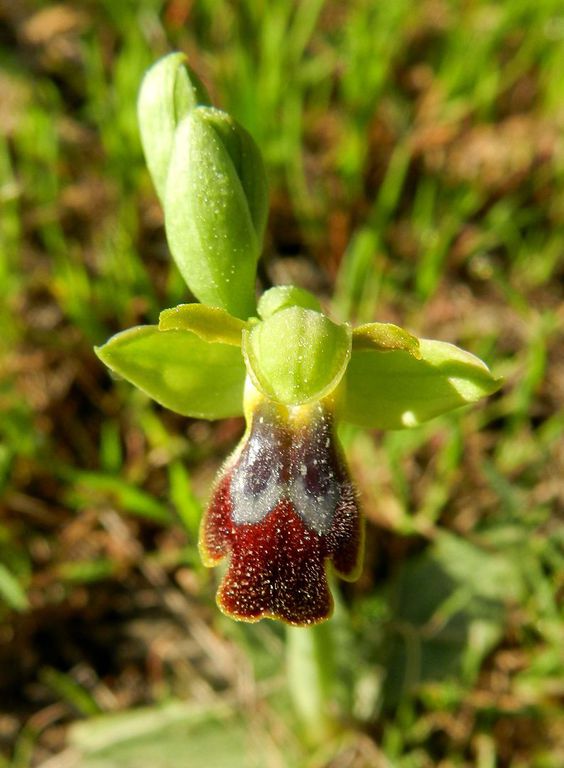 DESCRIPCIÓ DE LA PLANTA: Herba perenne, amb bulb. Només es veu durant l’estació favorable. Fulles en roseta basal, ovado lanceolades. Lòbul central emarginat , vellutat, negrós, marró violaci o marró obscur amb la vora marginal de color groc. Macula bipartida, poc brillant, generalment glabra, amb el bord apical de color gris - blavós