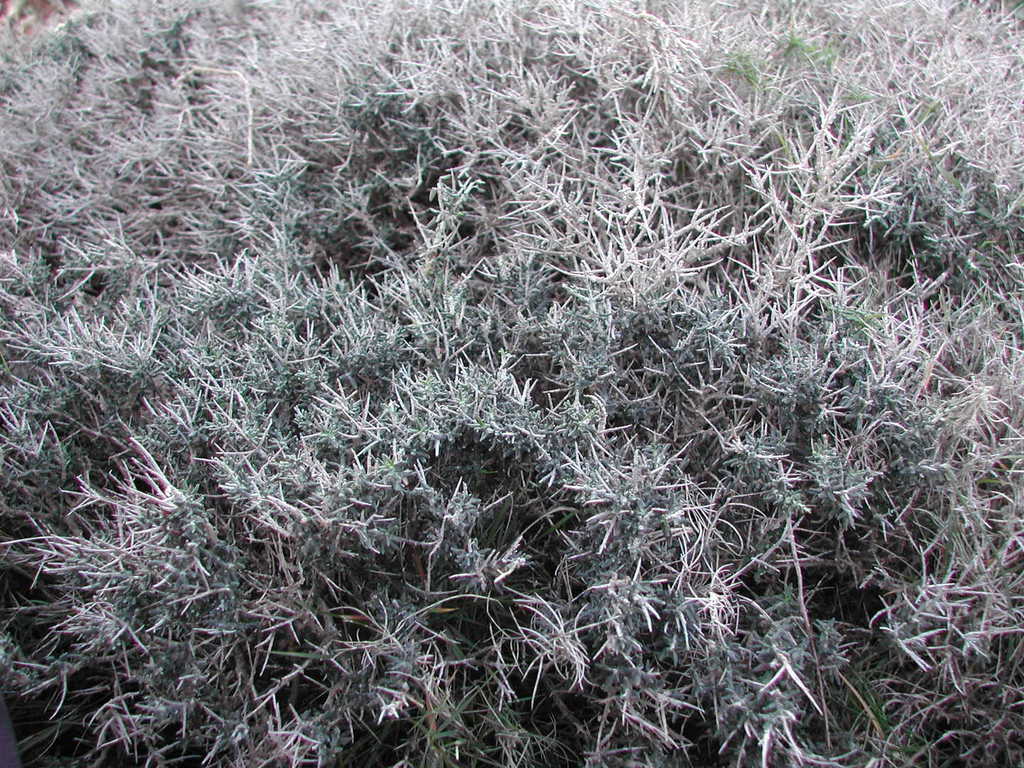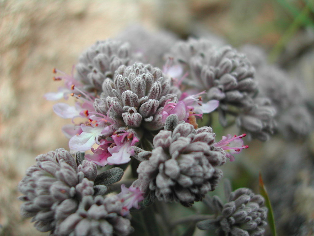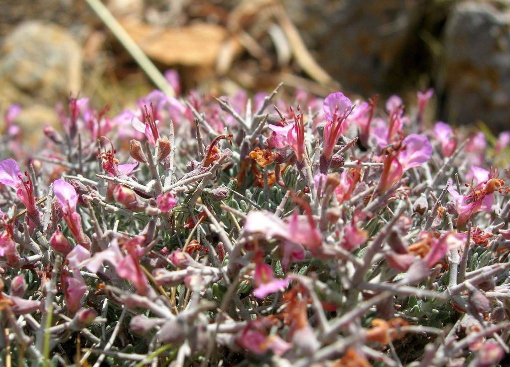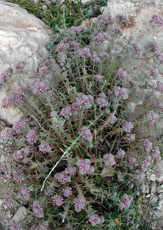 DESCRIPCIÓ DE LA PLANTA:Coixinet subespinós, tomentós i suaument aromàtic. Fulles revolutes, enteres o crenades, grisenques pel revers. Flors rosades o purpurines