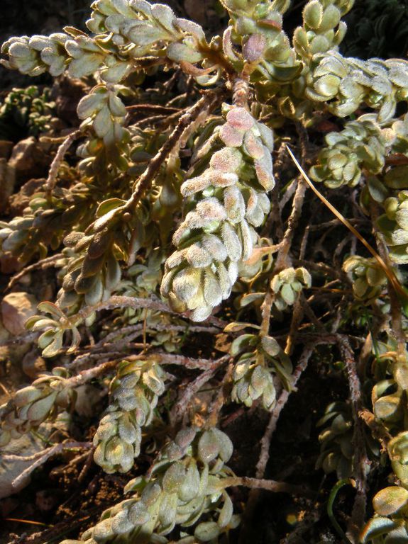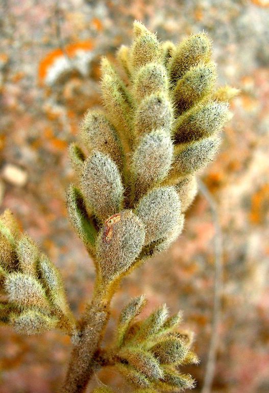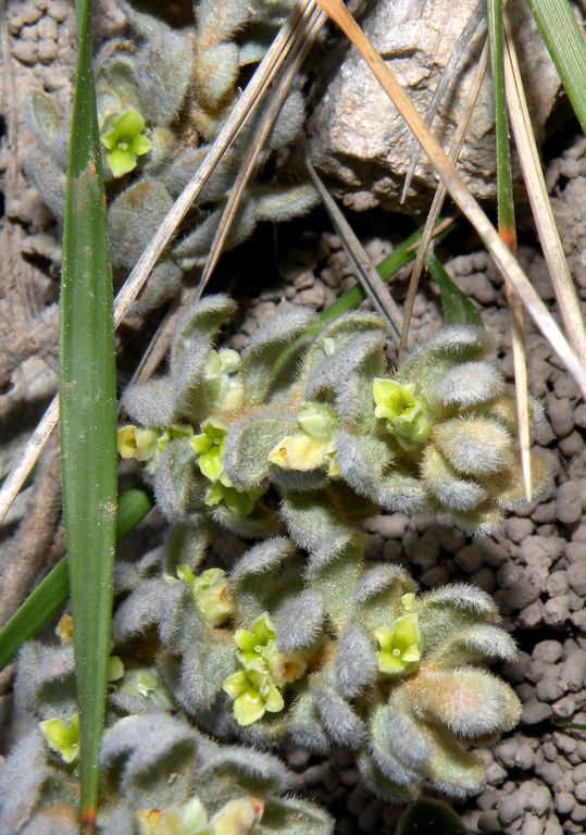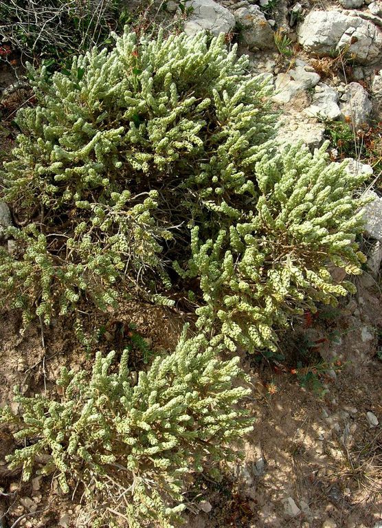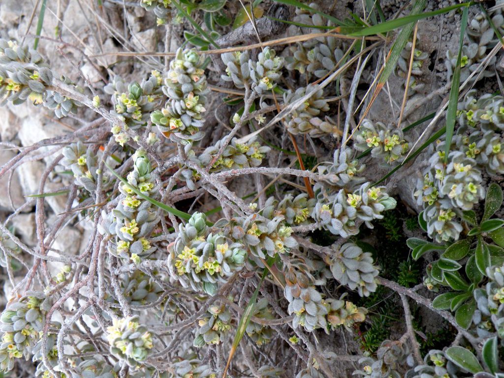 DESCRIPCIÓ DE LA PLANTA: Arbust que té les fulles acumulades a la part apical de les branques, totes elles incloses les tiges joves estan cobertes per una densa pilositat que dóna a la planta un color gris blanquinós, de vegades groguenc. Les fulles són ovalades i gruixades. Flors grogues agrupades a l’axil·la de les fulles. Nanofaneròfit